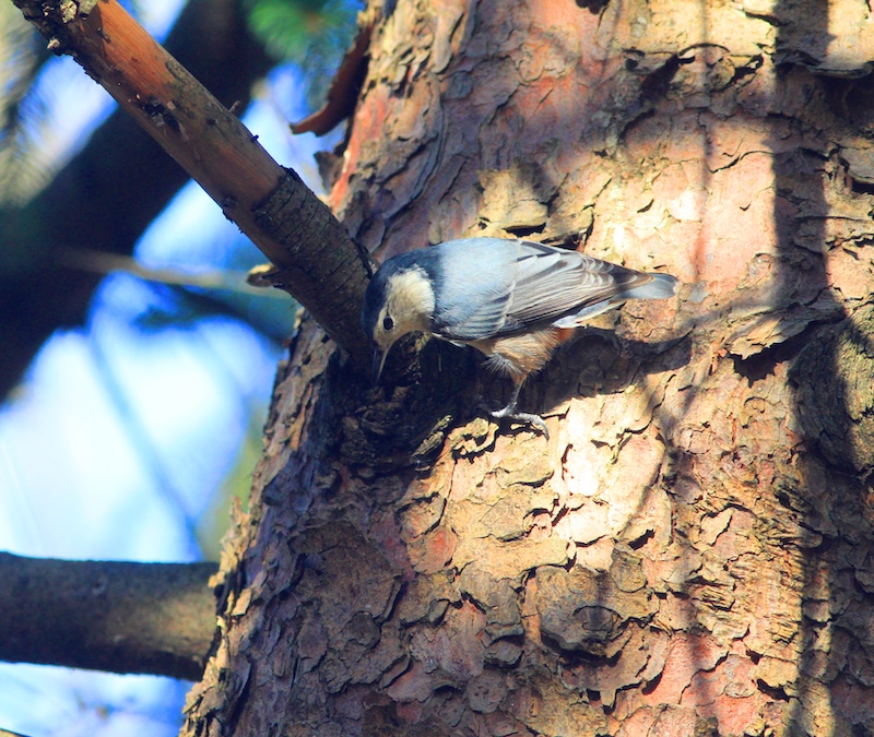 Nuthatches don’t tap on wood to communicate with their brethren like woodpeckers do. Instead they make unusual sounds that alert you to their presence, but are really meant to communicate with other birds. The white-breasted nuthatch calls a loud, “yank, yank, yank” year-round and a faster courtship song in spring and summer, while the red-breasted nuthatch call has been likened to the sound of repeated pitches on a tin horn. It also gives scolding sounds and high-pitched chatters. Listen here to the sounds of the white-breasted and red-breasted nuthatches.